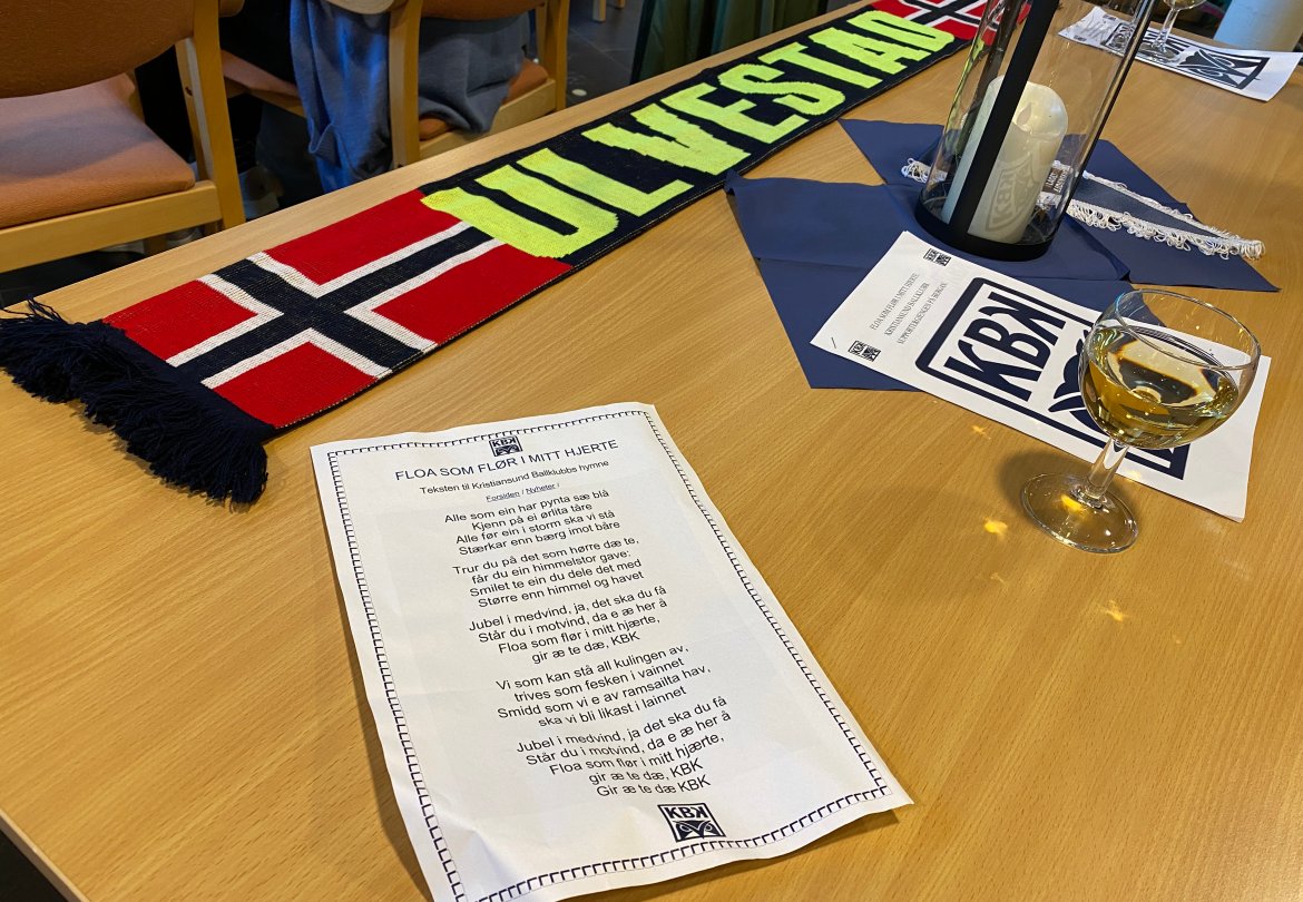 Storstua på Bergan er fylt opp med beboere og pårørende som synger med på Floa som flør mens bildene fra stadion bølger over storskjermen. Vegger og bord er pyntet med KBK-draker, flagg og skjerf, mens personalet serverer godsaker ved bordene.