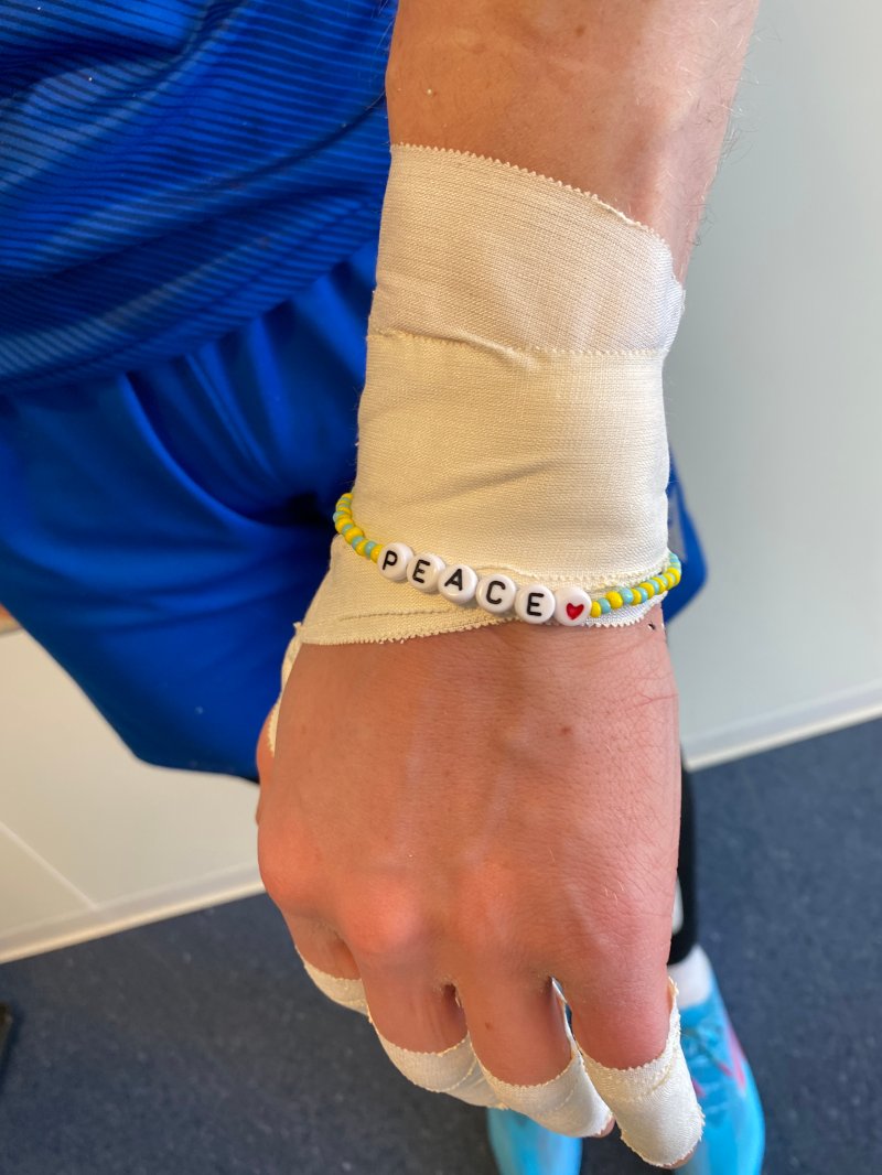 Armbåndene i gul, blå og hjerter med flere budskap som PEACE, STOPWAR, IMAGINE, MARIUPOL, SLAVA UKRAINI.