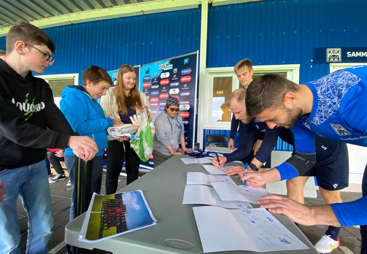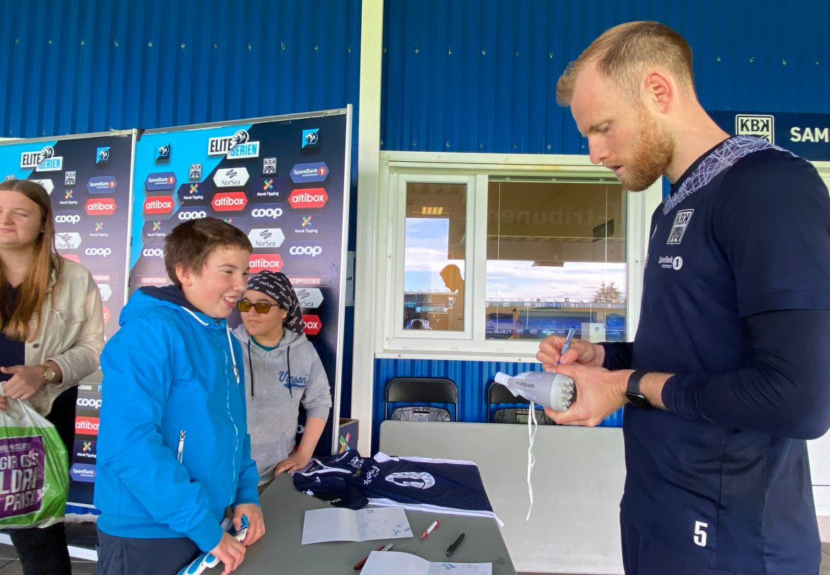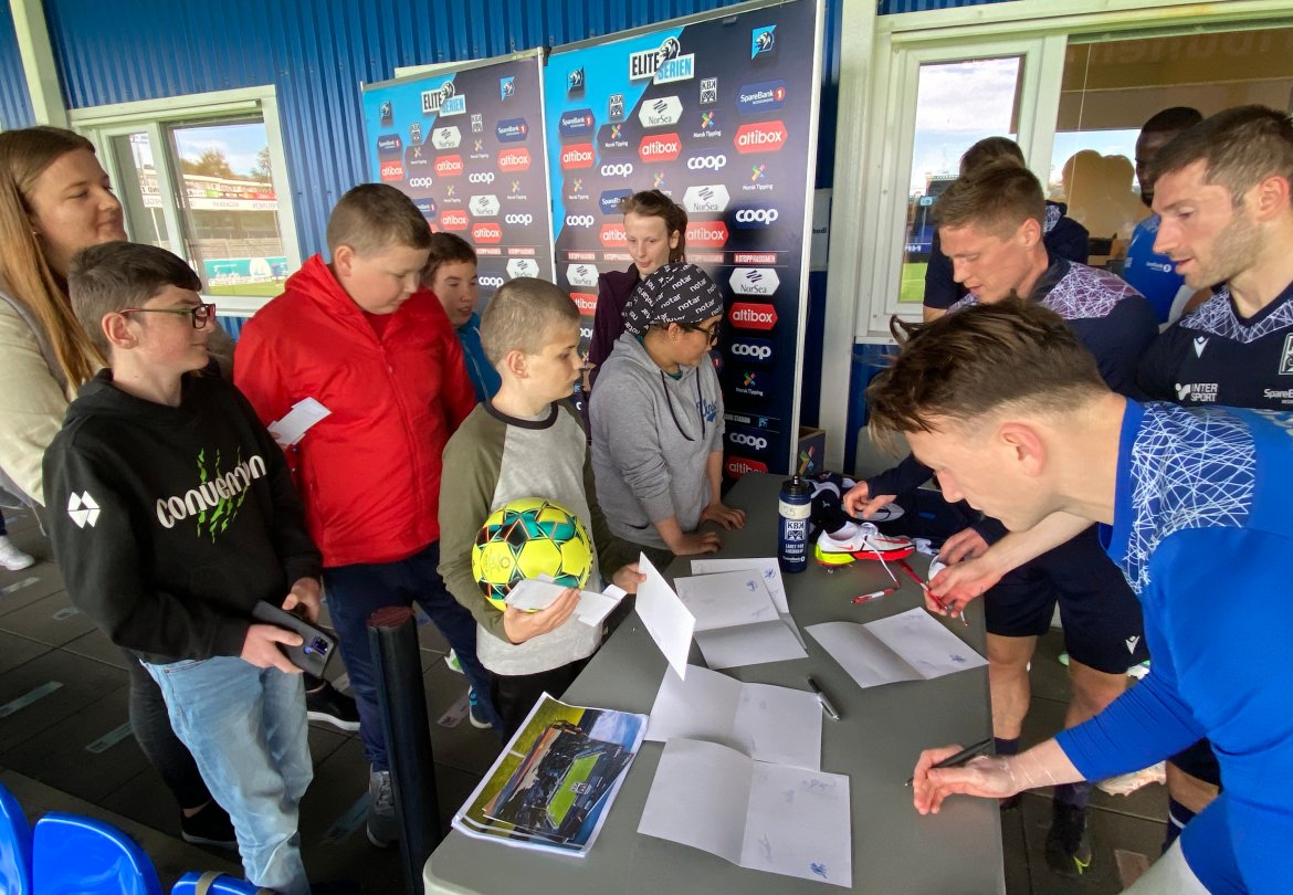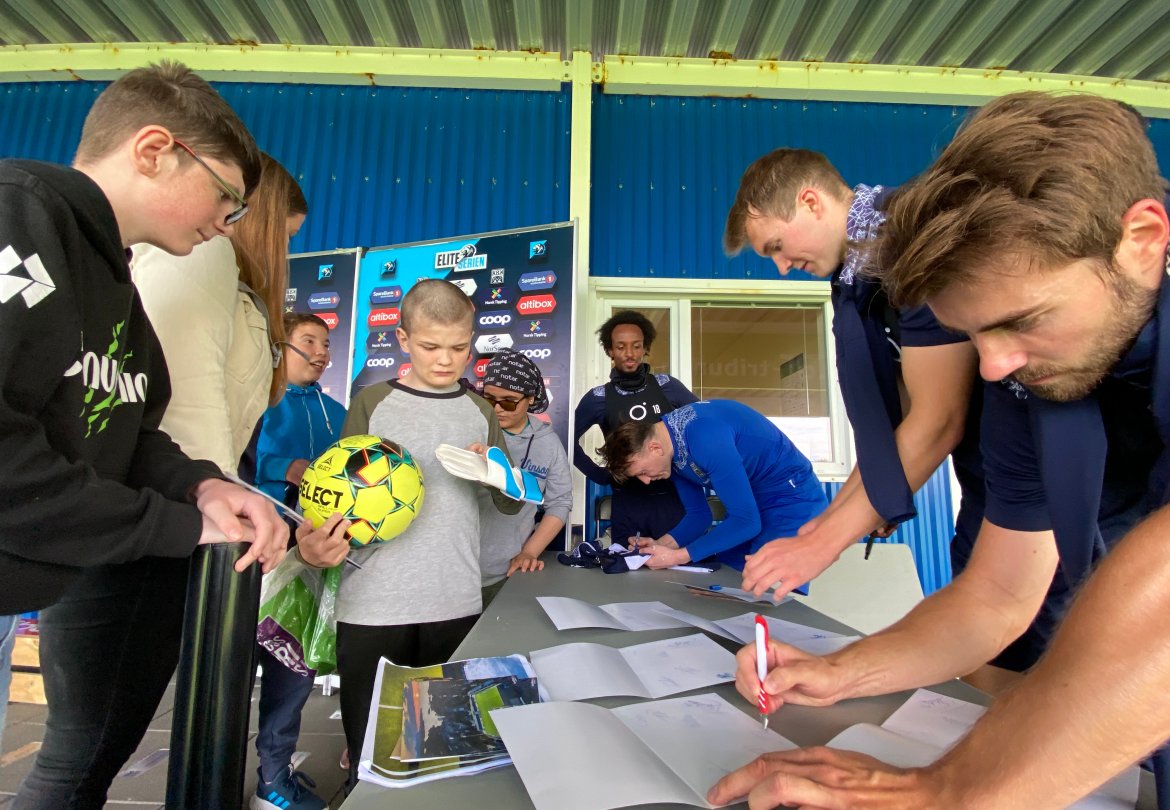 Etter treninga slo spillerne av en prat med gjestene fra Nordlandet ungdomsskole, og det ble både tid til signaturer på bilder, trøyer og keeperhansker i gave.