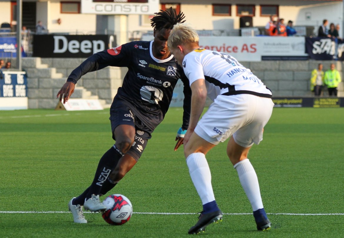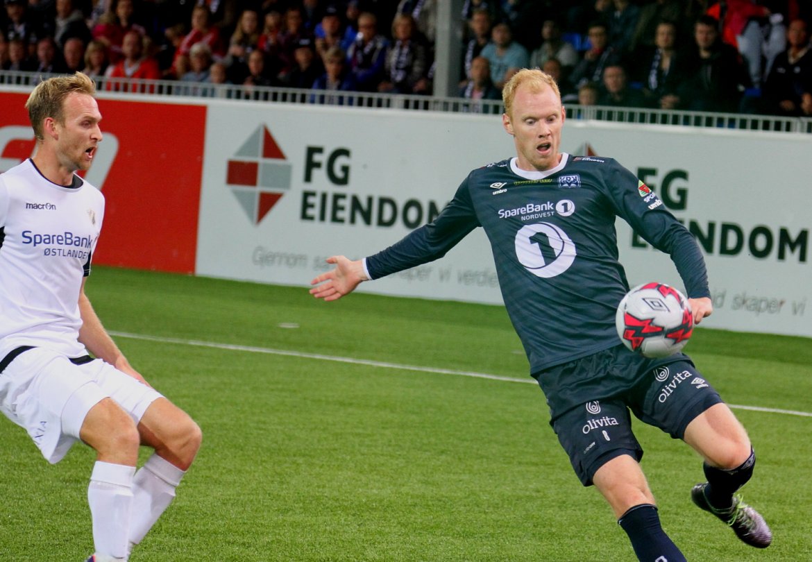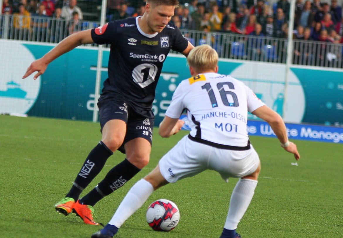 KBK åpnet friskt, og virket pigge når de angrep. Etter 13 minutter skjer det som får 3874 tilskuere til å ta fullstendig av på tribunen. KBK byr på flott angrepsspill når Stokke trer gjennom Gjertsen i 16-meteren. Kantspilleren avslutter i steget fra skrå vinkel til venstre i feltet, og triller inn sin andre scoring siden han kom til Mørekysten i sommer. 1-0, og KBK får en pangstart på kampen.