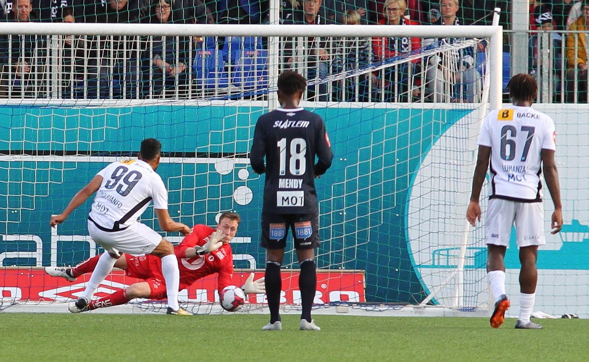 Eliteseriens toppscorer Ohi Omoijuanfo trer frem for å ta straffen. Spissen prøver å vente ut Sean McDermott, men sisteskansen er med på notene - går riktig vei og redder straffen! Full kok og enorm jubel på tribunene.