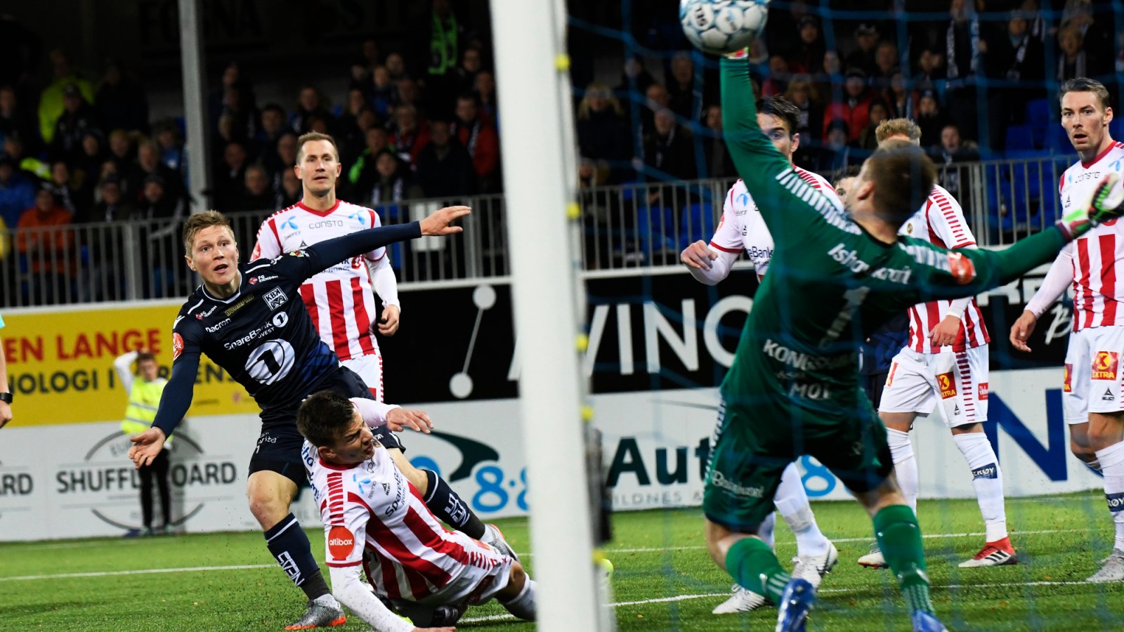 Etter 35 minutter skaffer Torgil Gjertsen KBK frispark på 30 meter ute til venstre. Aasbak slår hardt inn på bakerste hvor kaptein Dan Peter Ulvestad smeller ballen tilbake inn i feltet. Der venter Liridon Kalludra som demper og kliner ballen i vinkelen. 1-0 og Kristiansund stadion eksploderer. En praktscoring av den svenske teknikeren!